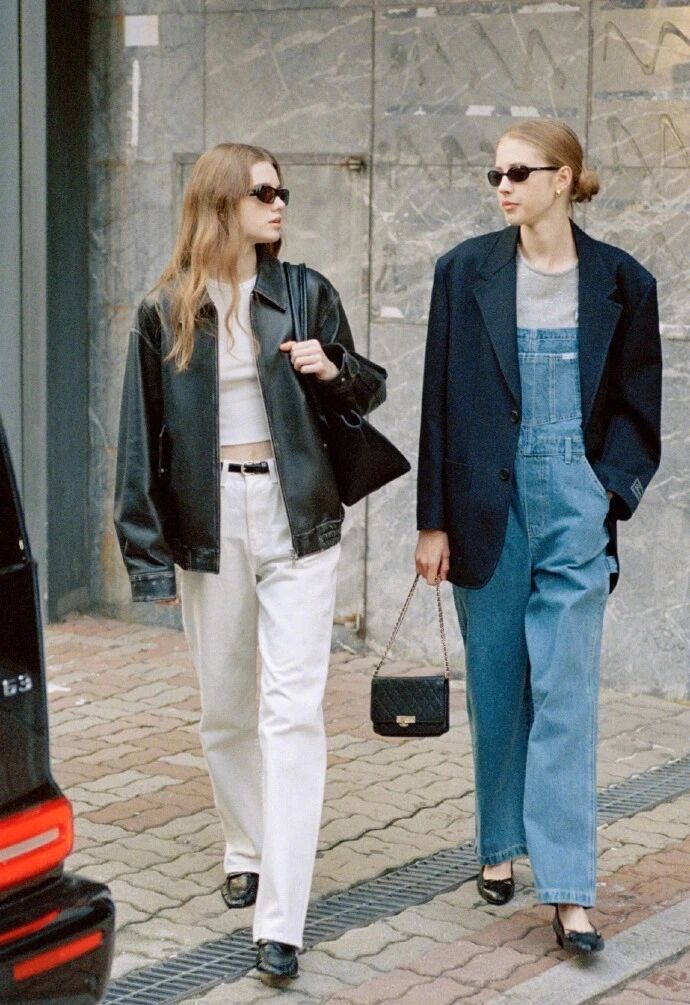 On the left, a black leather biker jacket tops a white crop top and straight-leg white jeans, finished with a black belt, leather tote, and loafers. It's sharp, high-contrast, and full of modern energy. On the right, an oversized navy blazer layered over blue denim overalls and a grey tee, paired with a quilted chain bag and black ballet flats. Together, they explore the spectrum between tough and playful within the same early spring street-style universe.