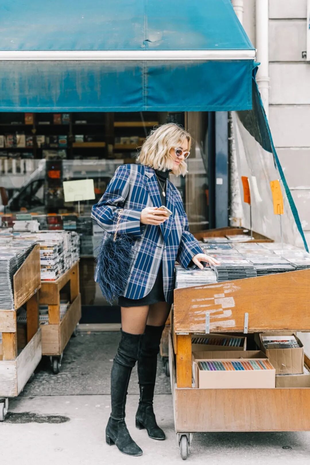A blue plaid oversized blazer thrown over a black turtleneck mini dress, styled with black suede over-the-knee boots and a feather-textured shoulder bag. The structured shoulders and exaggerated boots add runway energy, while the mini dress keeps things streamlined. Perfect for night walks through the city, art openings, or rooftop drinks when the air is still a bit cold.
