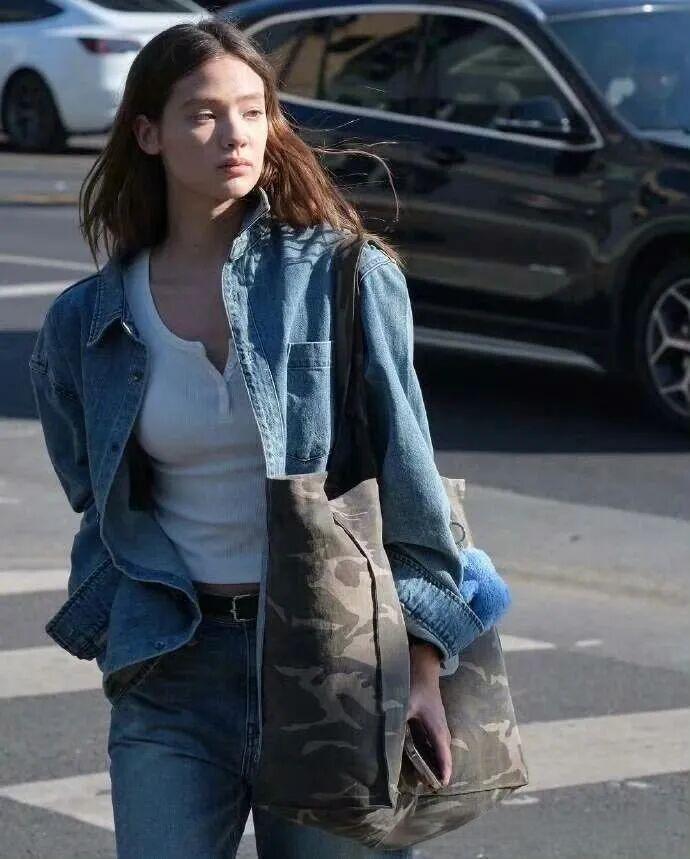 Double denim with a white henley and camo tote captures an easy, off-duty early spring street style.