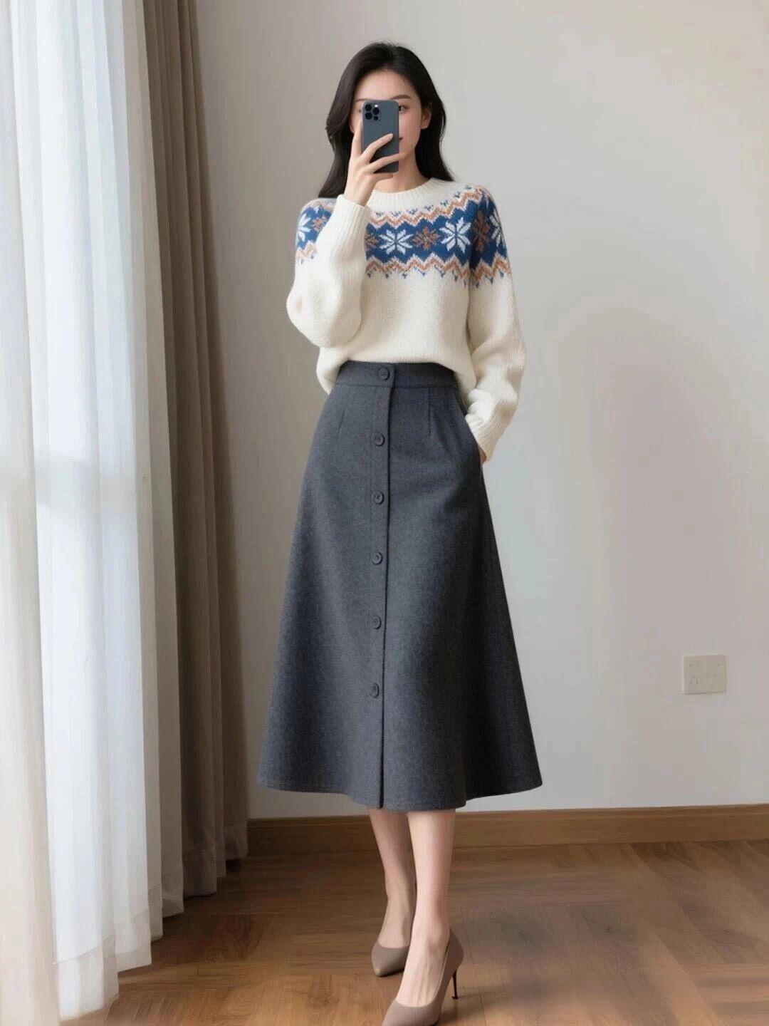 An off-white Fair Isle sweater with blue and brown patterns tucked into a dark grey button-front A-line midi skirt, worn with taupe pointed heels. The knit's retro pattern warms up the structured skirt, making the outfit feel both nostalgic and sharp. It's a great choice for campus, libraries, understated office settings, or cozy dinner plans.