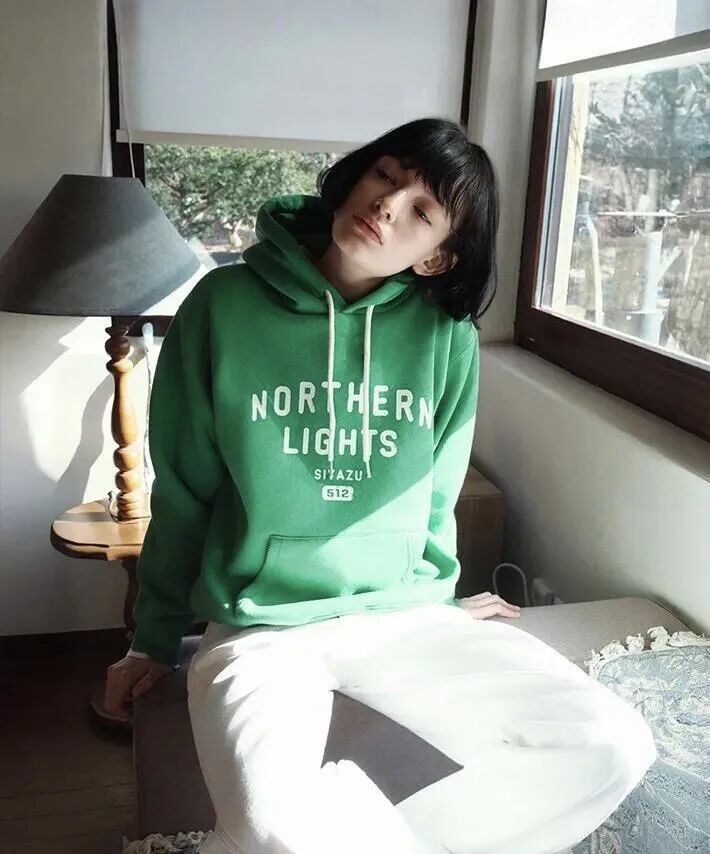 A vibrant green hoodie with "NORTHERN LIGHTS" lettering paired with crisp white wide-leg trousers styled with a black belt and a black leather tote. The saturated color on top pops against the neutral base, creating a fresh, sporty streetwear mood. The relaxed proportions feel perfect for slow weekends, travel days, or just leaning fully into comfort while still looking intentional in photos.