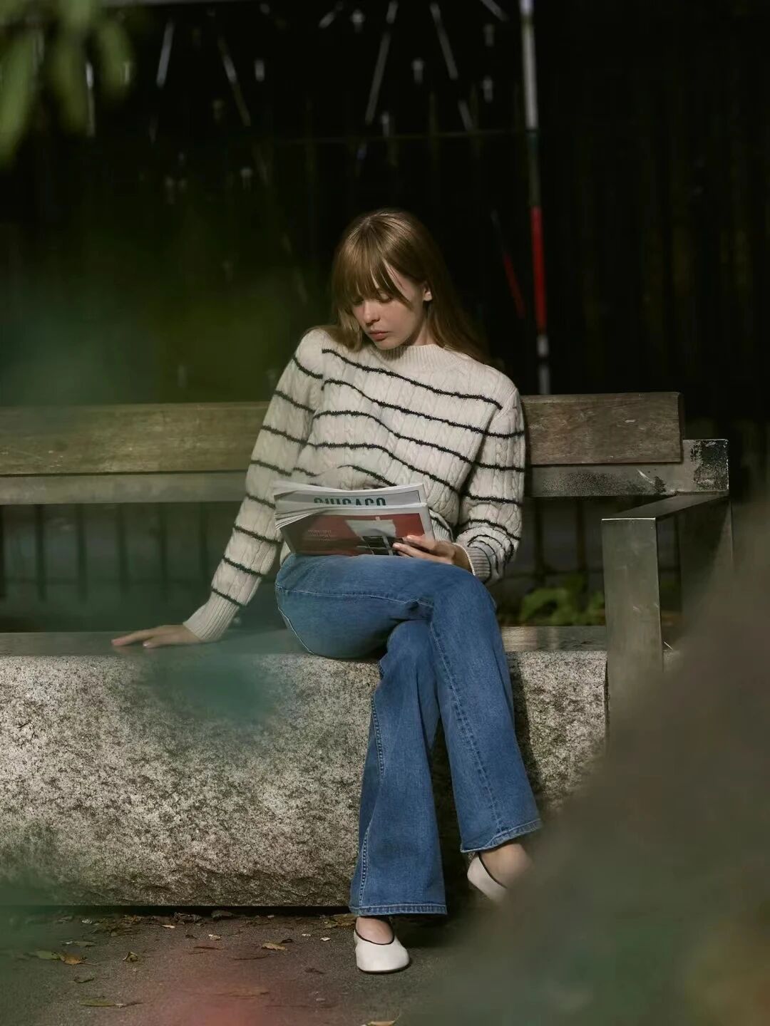 A cream-colored oversized cable-knit sweater with horizontal black stripes paired with relaxed mid-wash blue jeans and minimalist white ballet flats. The chunky texture of the knit provides cozy structure against the casual fluidity of denim, while the delicate flats add a touch of feminine ease. This look channels both French-girl nonchalance and a subtle Dark Academia mood — perfect for quiet city strolls, library sessions, or an unfussy weekend coffee date.