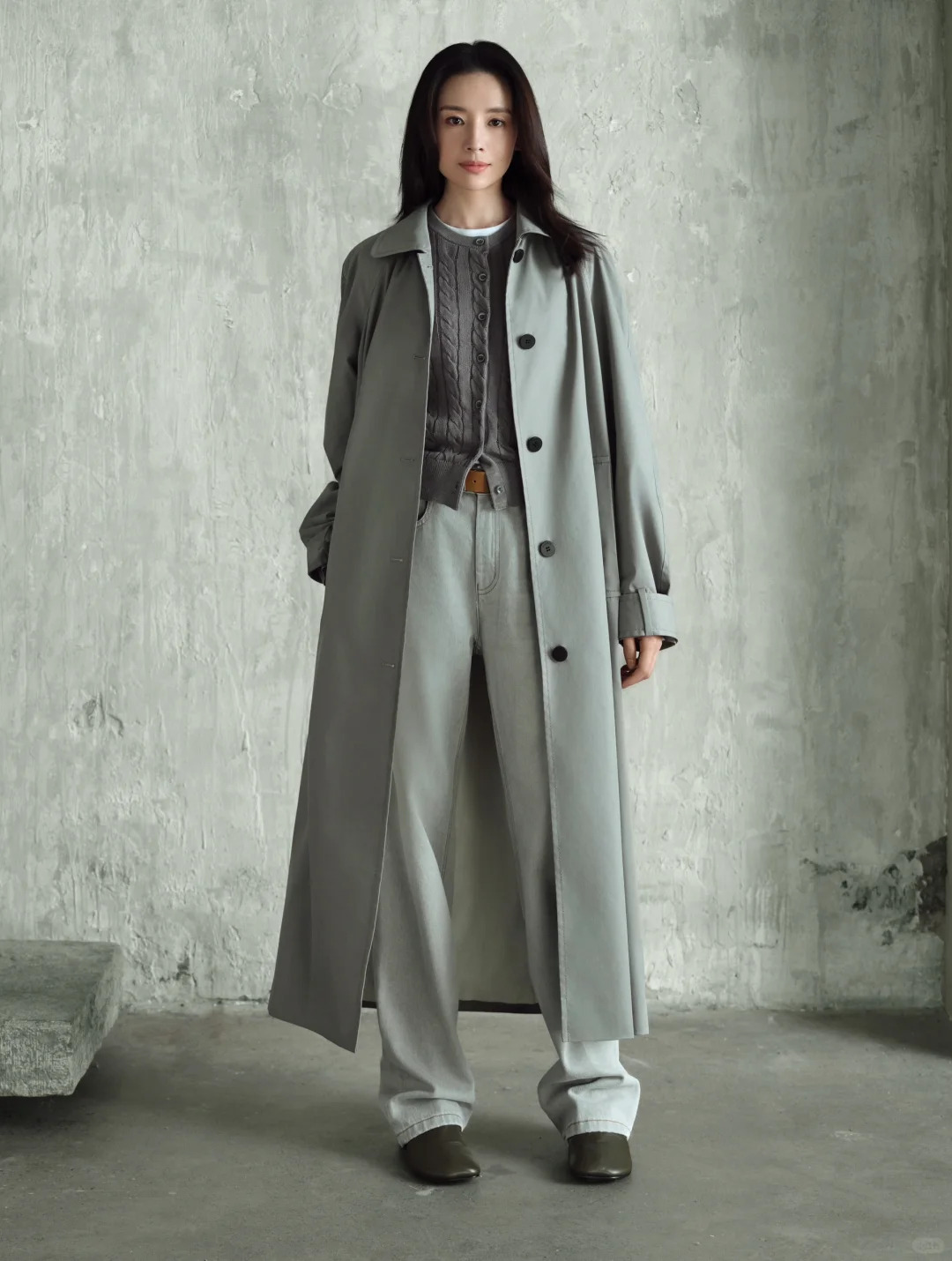 A sage trench over tonal greys creates a minimalist monochrome outfit that feels both calm and quietly luxurious.