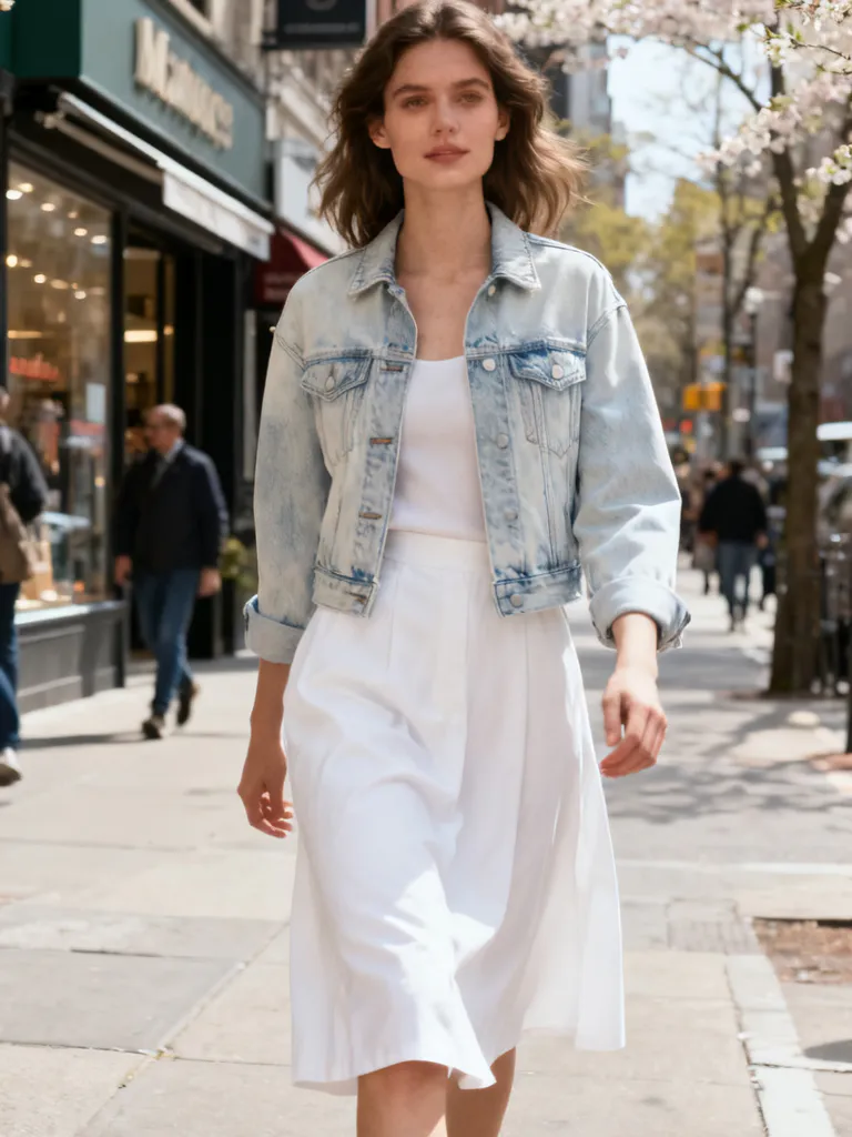 A spring denim jacket styling guide with outfit ideas for pants, dresses, and skirts — plus tips on choosing the right denim wash for every look.