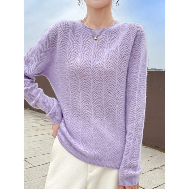 Lavender knits with light pants feel soft and modern.