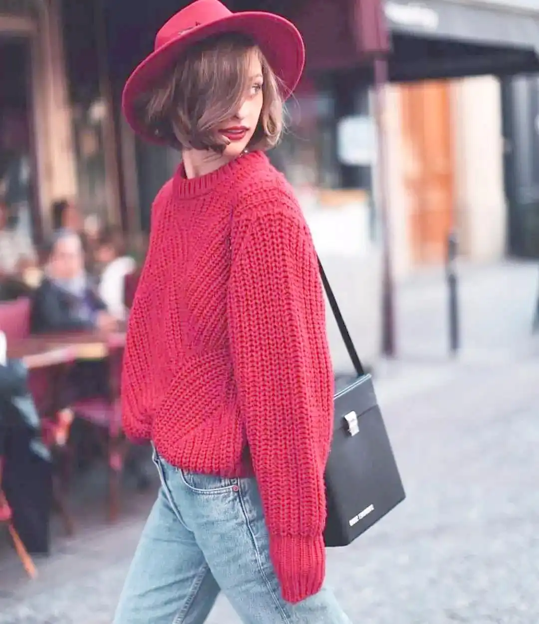 - Red sweater + black jeans for a sharp, simple look