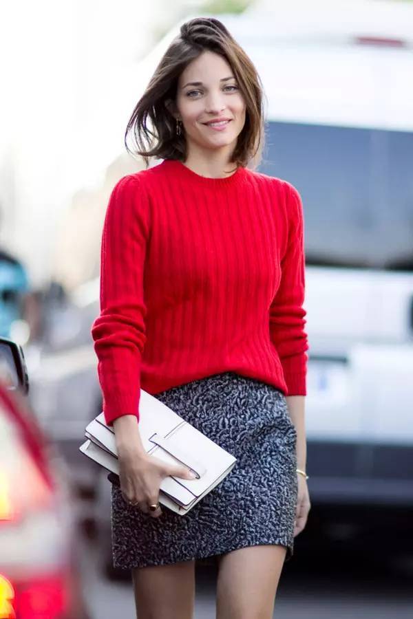 A red sweater with a mini skirt feels playful and bold.