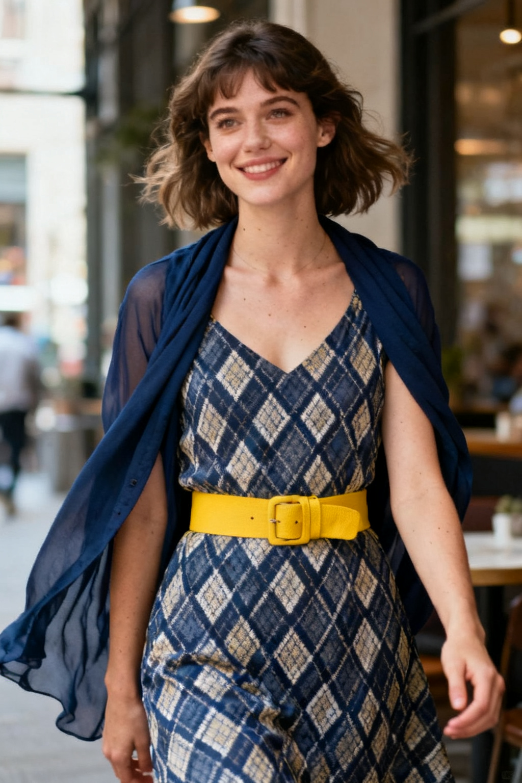 A navy cardigan on the shoulders tones down a playful argyle dress. A bright yellow belt lifts the waistline and sharpens the whole look. The result is calm yet striking, feminine with a clean and confident edge.