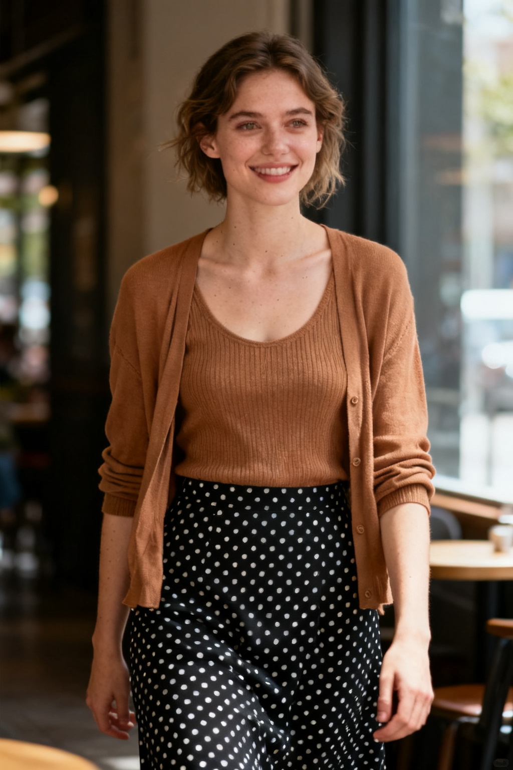 A caramel cardigan and matching crew-neck top with a black-and-white polka dot skirt creates a soft OL look that is sweet but not sugary. It is elegant, flattering, and naturally warm in tone.