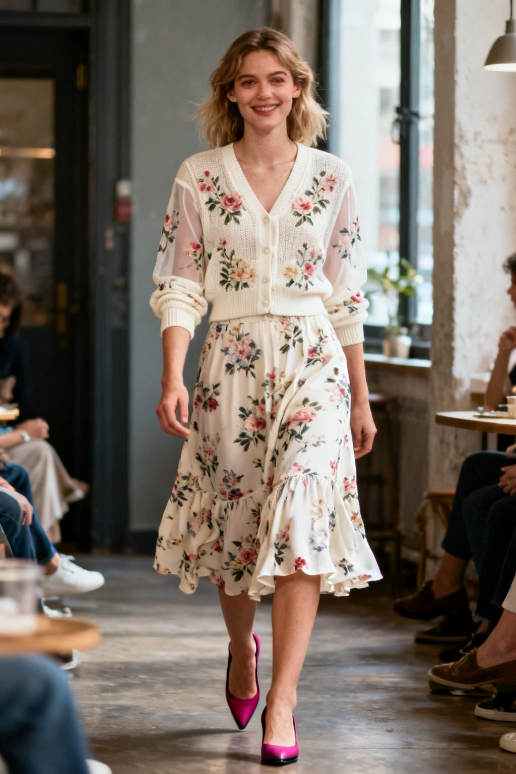 An ivory floral cardigan with a matching floral skirt creates a coordinated, airy silhouette. Light fabric and delicate print make the whole look feel breathable and romantic. Add contrast pumps for a subtle fashion twist.