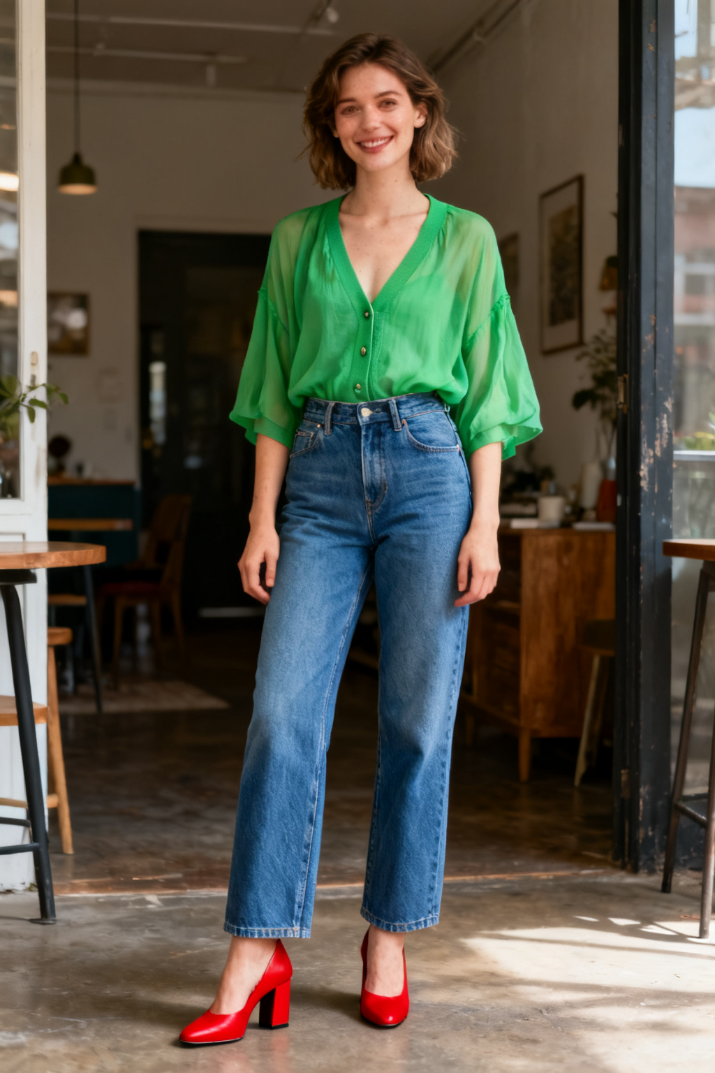 A bright green cardigan with high-waist straight jeans feels energetic and fresh. Finish with chunky red heels for a playful color pop. The lifted waistline instantly improves proportion and makes the legs look longer.