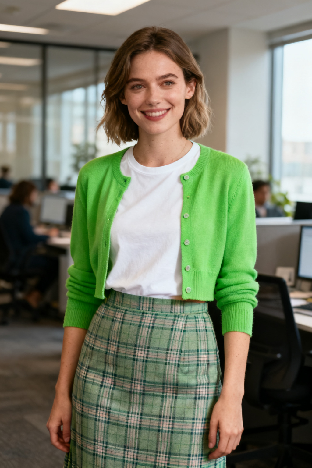 A cropped bright green cardigan with a white tee and plaid skirt subtly raises the waistline, making the outfit look taller and slimmer. The fresh green tone keeps spring workwear from feeling dull while still looking poised for office routines.