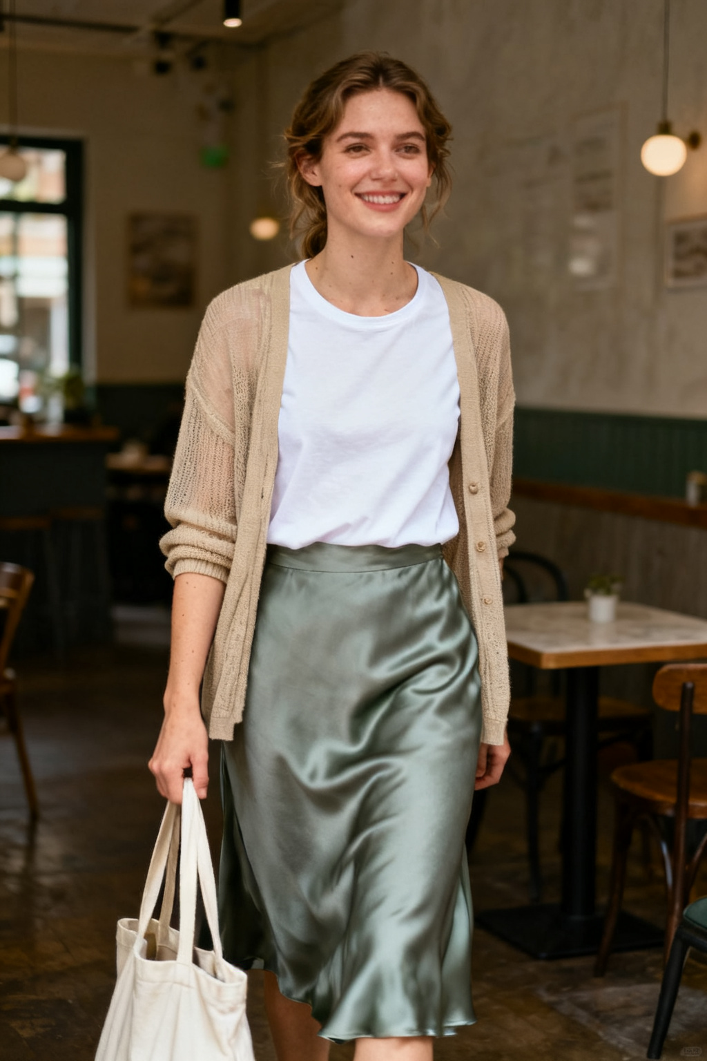 A light khaki cardigan layered over a white tee with a gray-green satin skirt feels neat and elevated. Sunglasses and a tote bag give it a composed, professional finish.