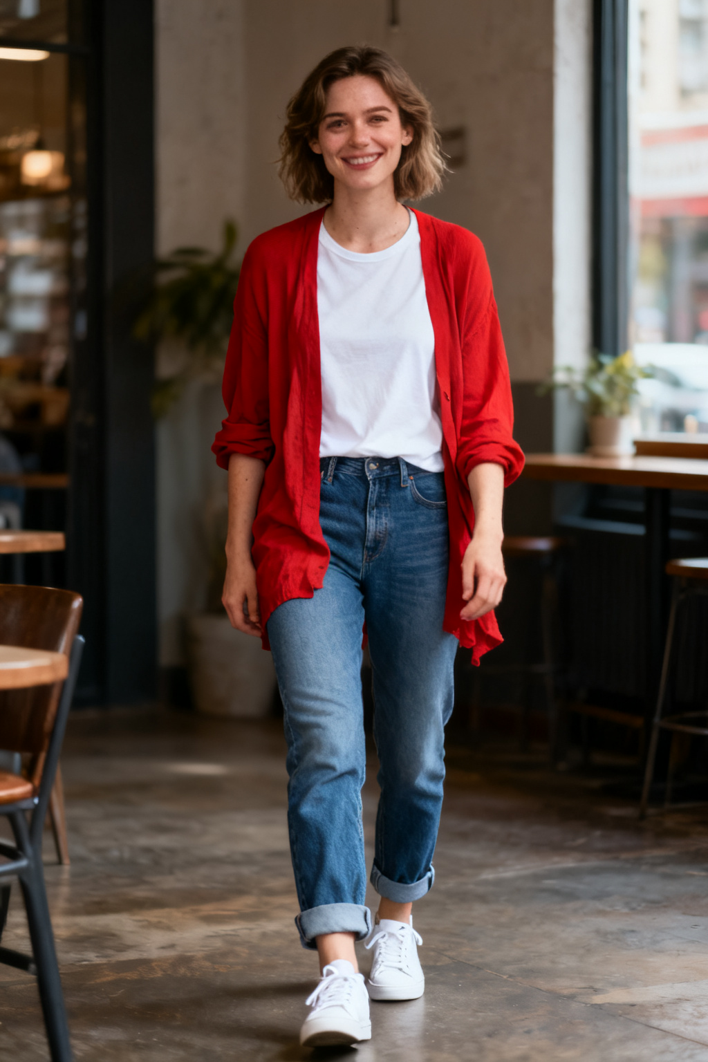 A true red cardigan over a white tee, cuffed jeans, and white sneakers: simple, relaxed, and highly wearable. Red brightens basic denim styling and adds a flattering glow to the complexion.