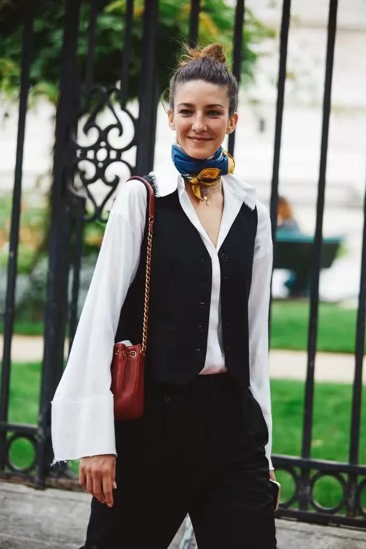 A relaxed white shirt under a vest, paired with wide-leg trousers or a skirt, feels timeless yet very now — especially in classic black-and-white.
