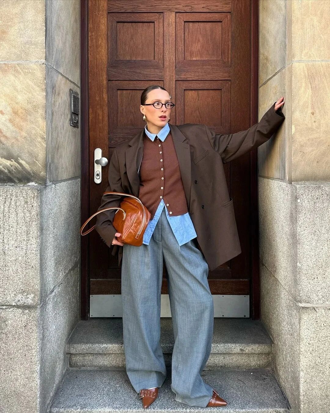 Mixing blue shirts with warm browns and textured knits creates depth without feeling over-styled.