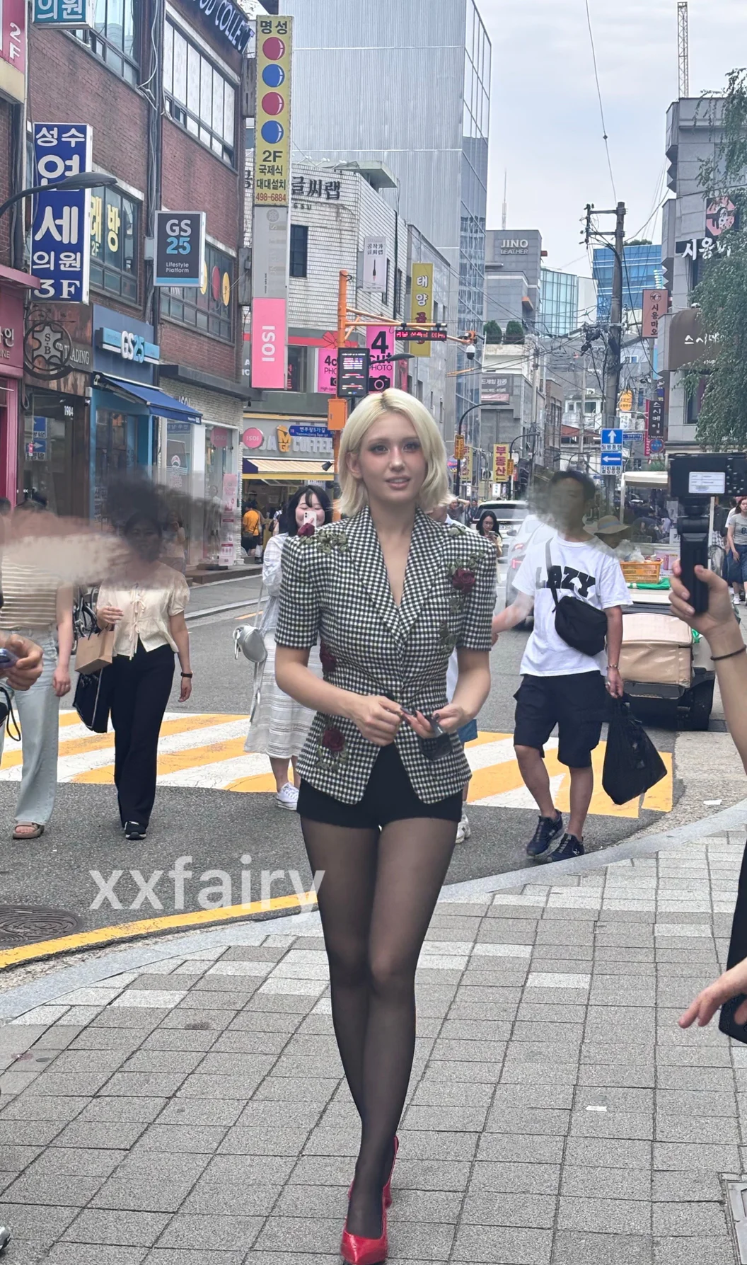 The structured coat paired with bare legs feels confident yet effortless—perfect for early spring transitions.