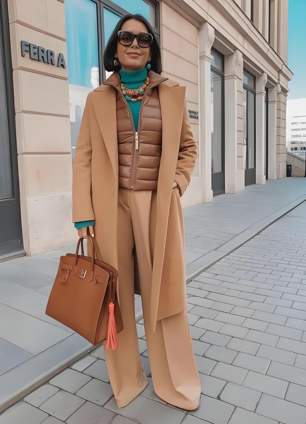 - A tailored down coat over a turtleneck and wool trousers