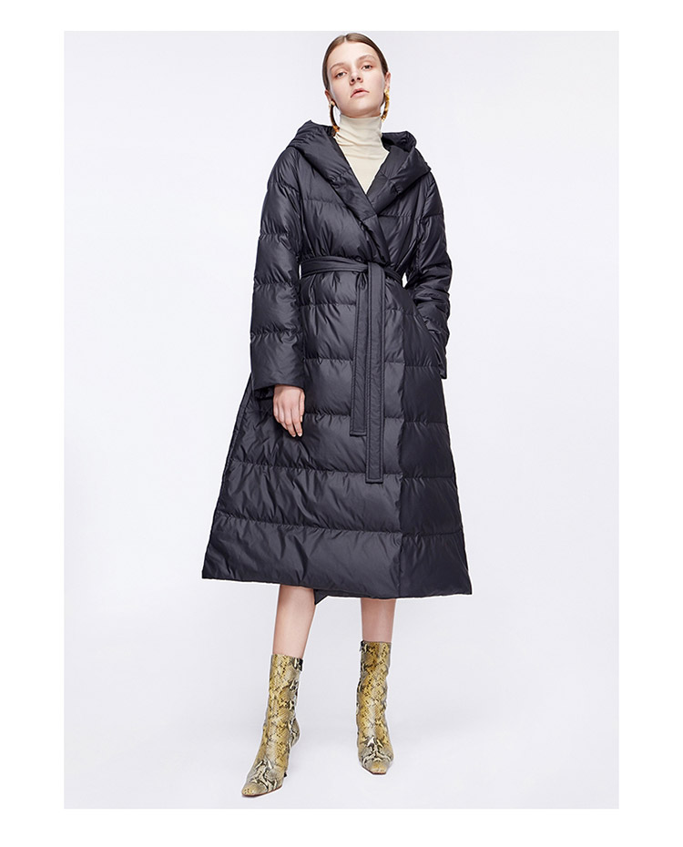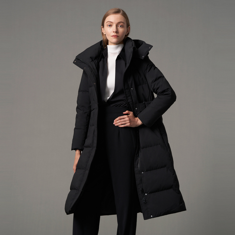 A belted long down jacket adds shape while keeping warmth.