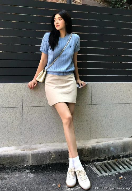 Casual Preppy Style: Light Blue Sweater and Beige Skirt Ensemble