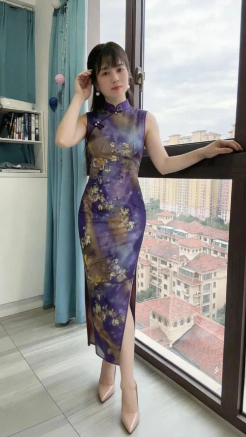 Elegant Purple Floral Qipao with Nude Heels for a Sophisticated Look