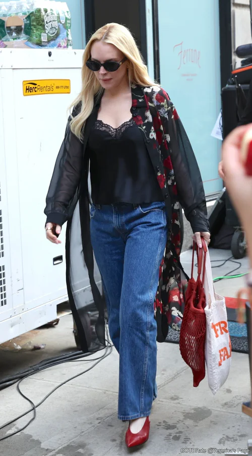 Casual Chic: Lace Camisole, Floral Duster, and Denim with Bold Accents
