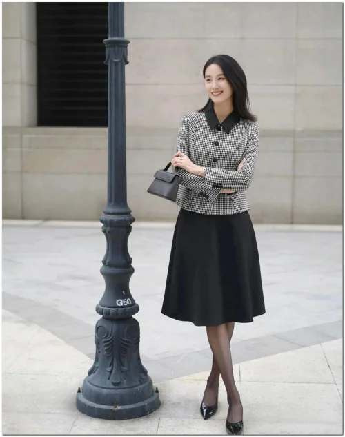 Houndstooth pairs well with solid colors like black, white, red, or even a pop of color for a modern twist. For a chic office look, pair a houndstooth blazer with tailored pants and a crisp white blouse. To add a touch of sophistication to a casual outfit, layer a houndstooth skirt with a cozy sweater and ankle boots. Mixing textures like leather or knitwear can also create interesting contrasts.
