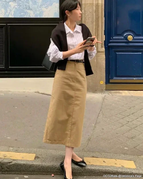 Midi skirts can be styled in numerous ways. For a casual look, pair a flowy midi skirt with a tucked-in graphic tee and sneakers. To dress it up, opt for a fitted top or blouse tucked in with heels or ankle boots. Play with proportions by adding a cropped jacket or a statement belt to define your waist.