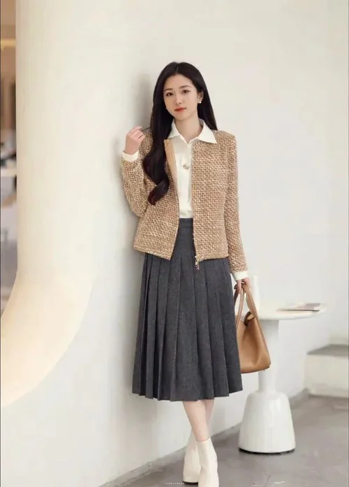 To style a pleated skirt, consider pairing it with a tucked-in blouse or a fitted top to balance the volume of the skirt. For a chic look, add a belt to define your waist. You can also layer with a structured blazer or a cozy sweater for a more polished ensemble.