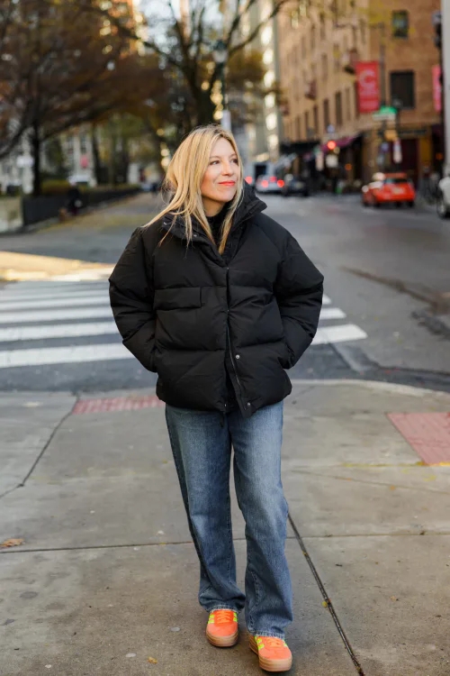 Puffer jackets can be styled casually with jeans and sneakers for a sporty vibe or dressed up with tailored pants and boots for a chic ensemble. Layer a fitted puffer jacket over a sweater or hoodie for added warmth and dimension. To balance the volume of the jacket, opt for slim-fitting bottoms like leggings or skinny jeans. Accessorize with a beanie and scarf to complete the cozy look.
