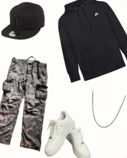 Mismatched Basics with Camouflage: A Blend of Hoodie, Cargo Pants, and Sneakers Gone Wrong