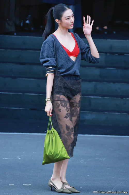 #Milan Fashion Week# Chaotic Fashion Mix: Red Top, Grey Sweater, and Sheer Lace Surprise