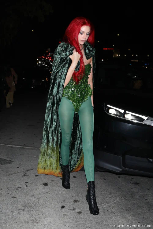 Green Velvet Cape with Leafy Bodysuit and Black Boots: A Nature