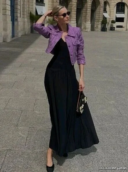 Elegant Purple Jacket with Black Maxi Dress and Floral Handbag Ensemble