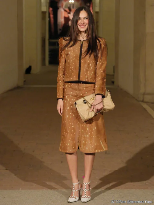 Elegant Brown Two-Piece with Studded Shoes and Beige Clutch