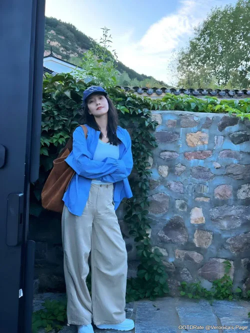 Casual Outdoor Chic: Blue Shirt, Beige Wide-Leg Pants, and White Sneakers