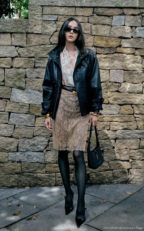 Elegant Lace and Edgy Leather: Urban Chic Outfit with Black Accessories