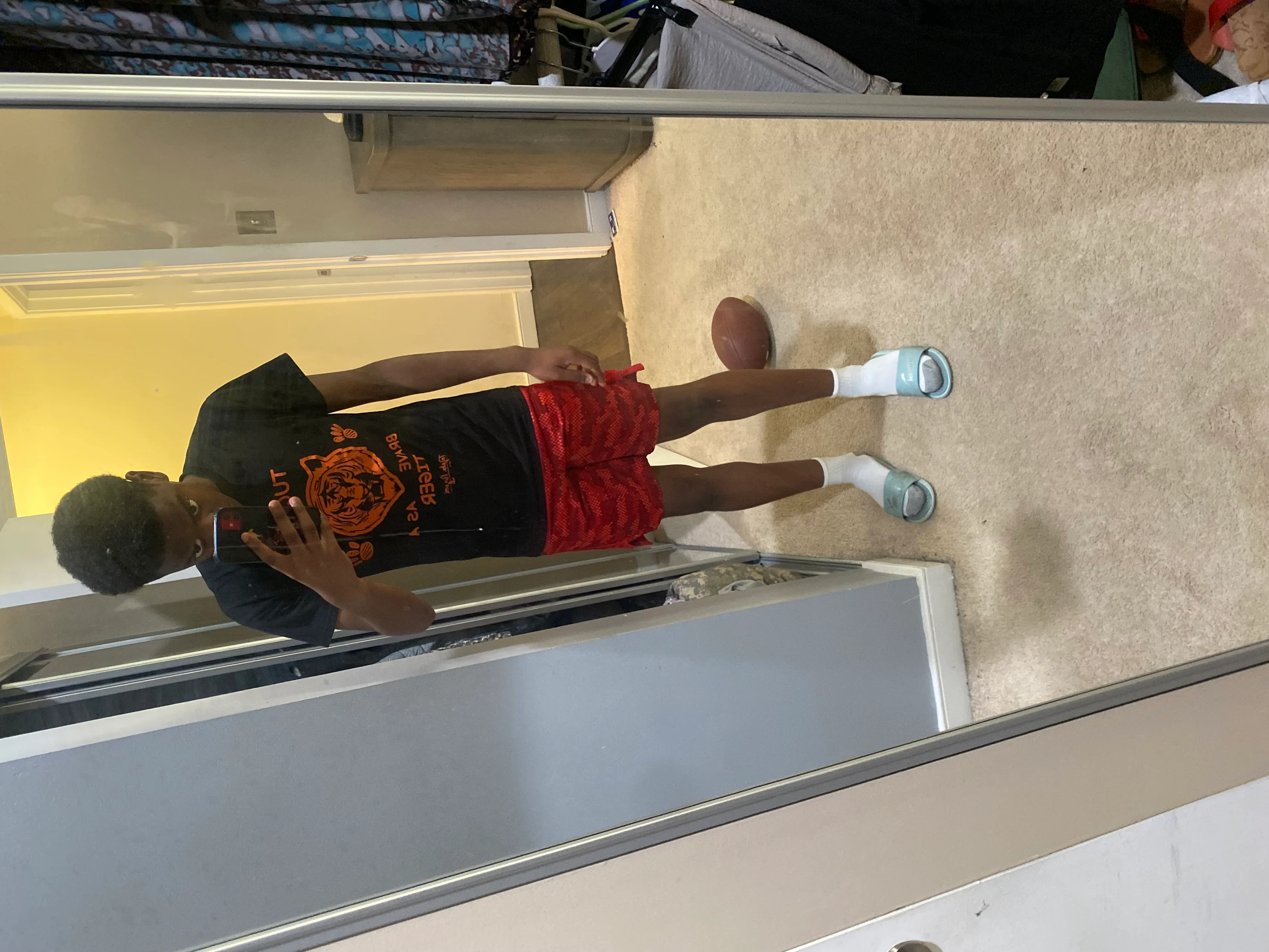 Based on the outfit in the image, I would rate it a 6 out of 10. The outfit consists of a black graphic t-shirt, red shorts, white socks, and slide sandals, which gives a relaxed and casual vibe, perfect for lounging or light outdoor activities.