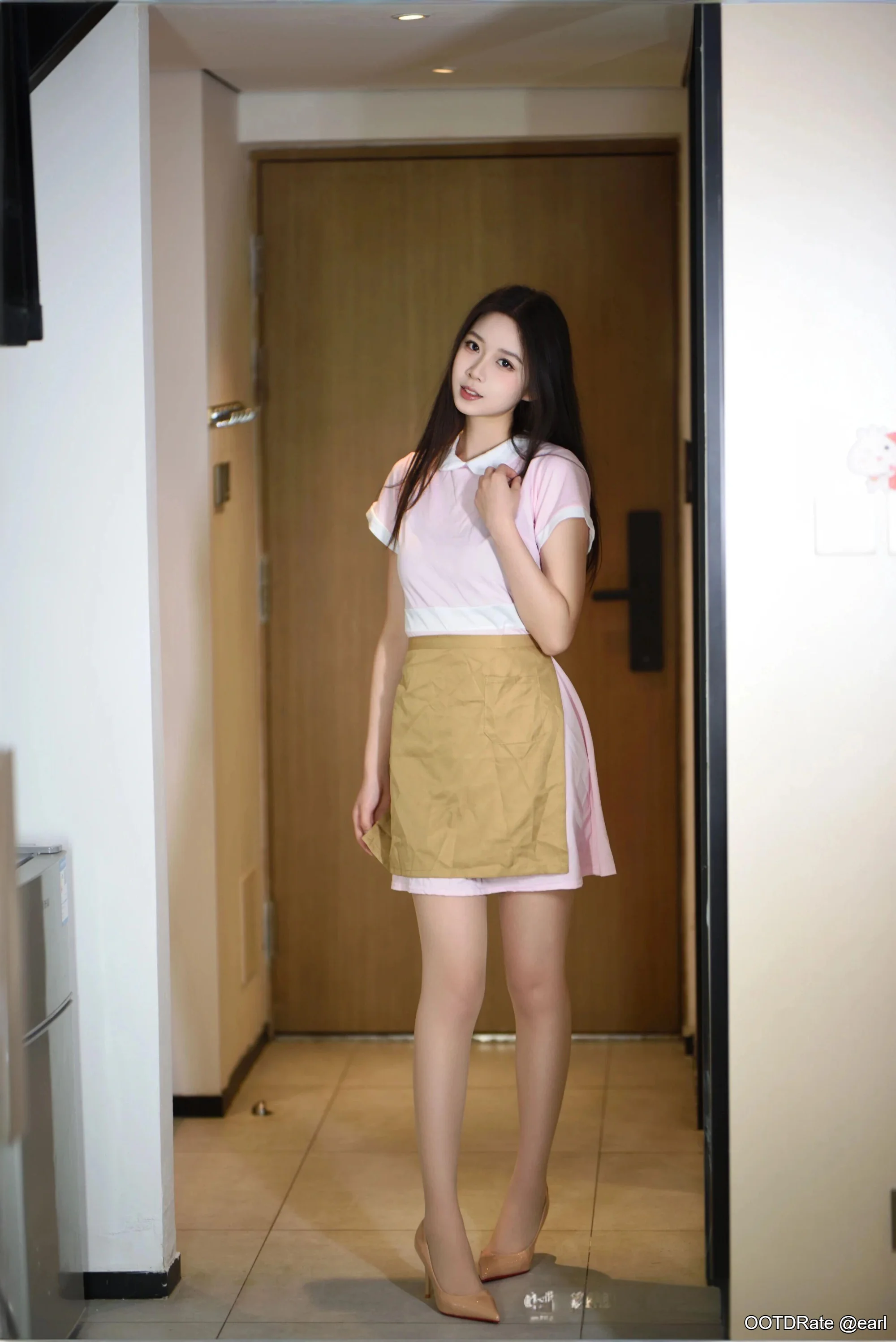 Minimalistic Light Pink Dress with Tan Apron and Neutral Heels