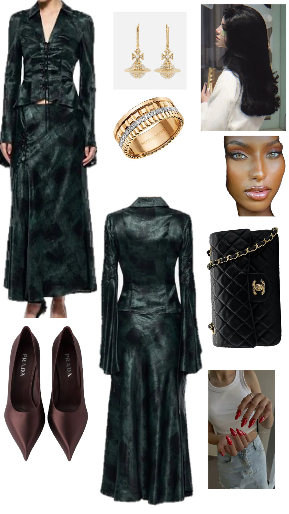 This outfit captures a sophisticated yet edgy aesthetic, blending elements of classic elegance with a contemporary twist. The deep green, almost black dress with its unique texture evokes an air of mystery and allure. Its fitted silhouette is well complemented by the flared bottom, adding a touch of drama and movement. The ruching detail near the midsection provides a thoughtful texture contrast, adding visual interest and enhancing the body's natural shape.