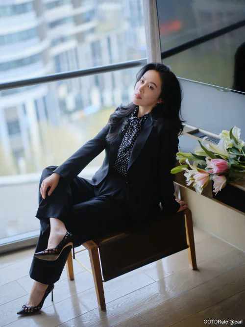 This outfit exudes sophistication with a touch of modern flair. The black suit, with its sleek lines and tailored fit, is a classic choice that provides a strong foundation. The addition of the polka dot blouse adds a playful yet professional twist, injecting some personality into the ensemble. The choice of a high heel with strap details complements the suit, elevating the overall look with a feminine touch.