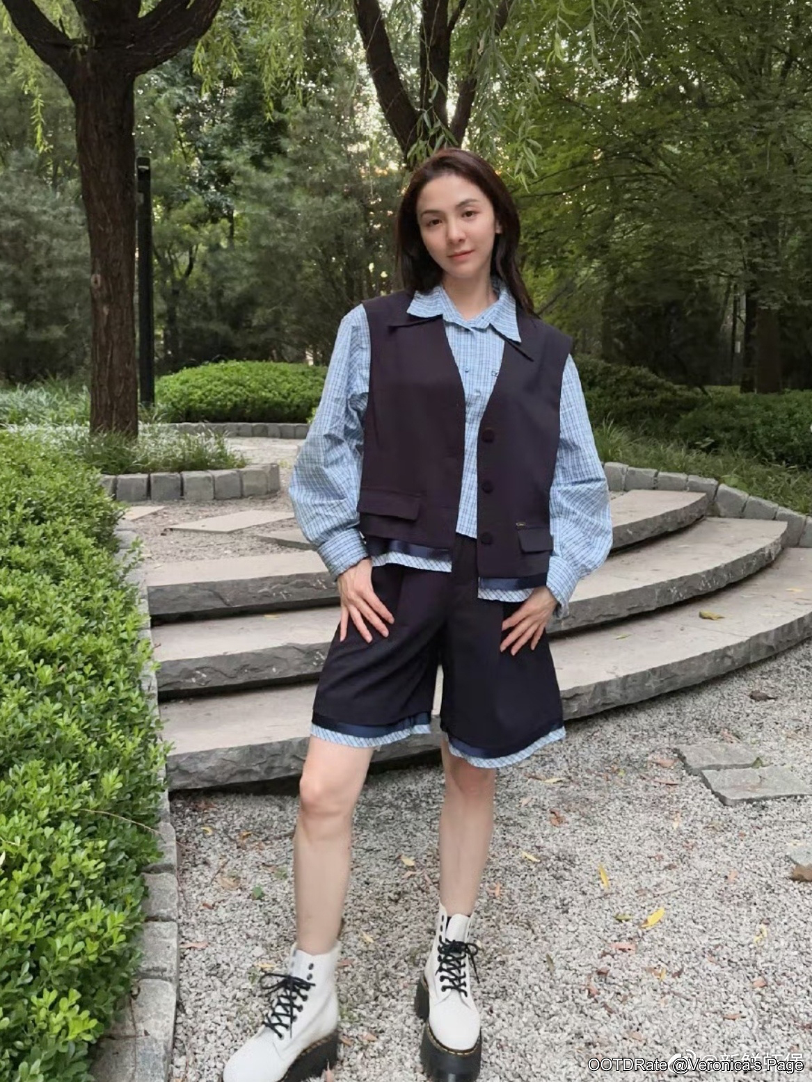 However, the fit and proportions could be improved. The oversized sleeves of the shirt inject a playful element, but they may overshadow the structure of the vest and shorts, potentially leading to an unbalanced silhouette. The choice of chunky white lace-up boots adds an edgy twist, aligning with the outfit’s youthful and bold vibe, but a more sleek shoe could enhance sophistication.