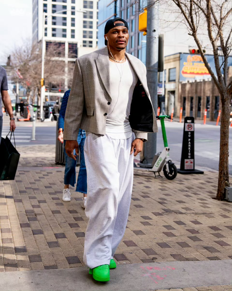 Eclectic Street Style: Gray Blazer, White Track Pants, and Vibrant Green Shoes