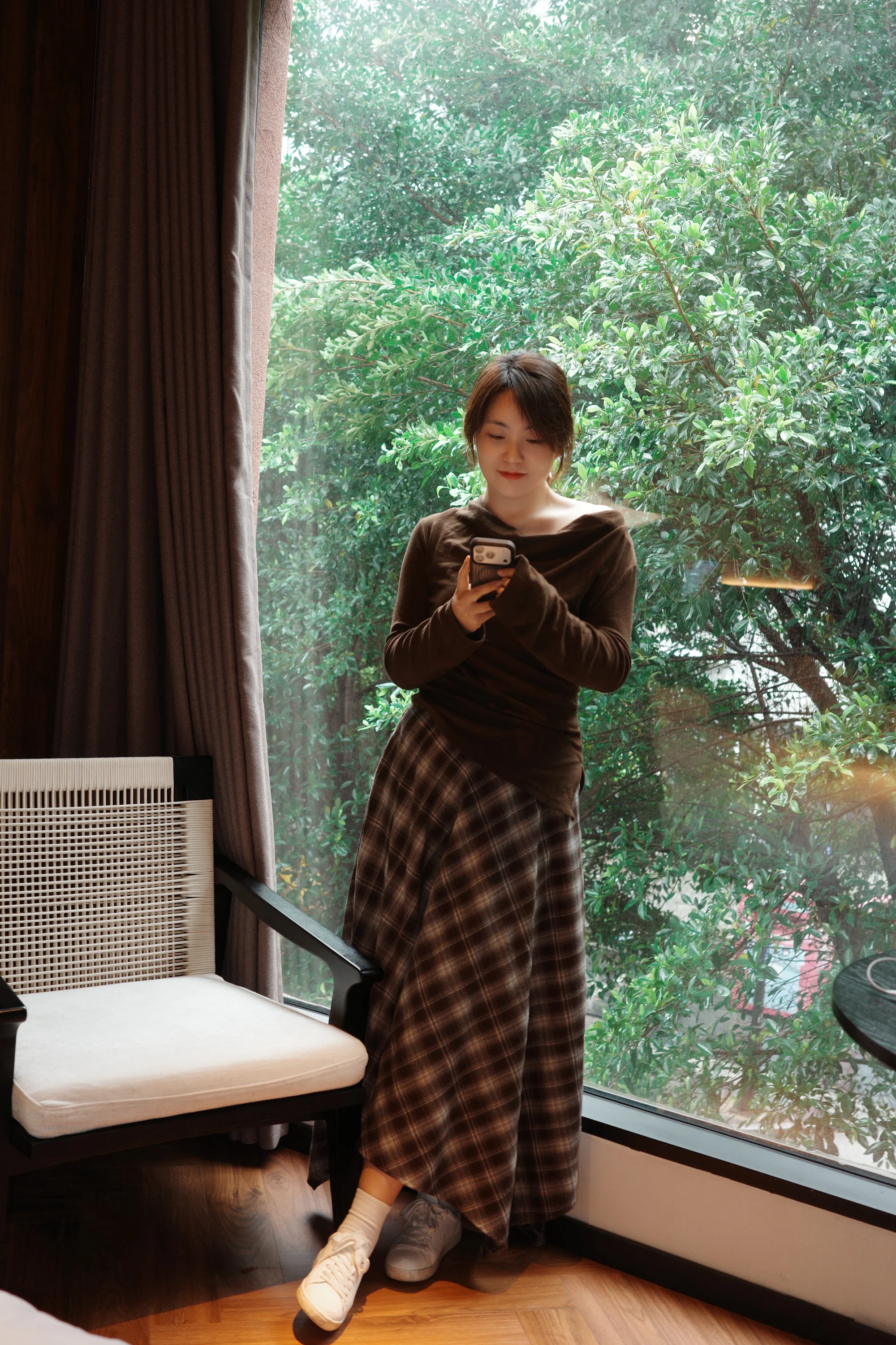 Casual Chic Style with Brown Top and Plaid Skirt for a Cozy Day