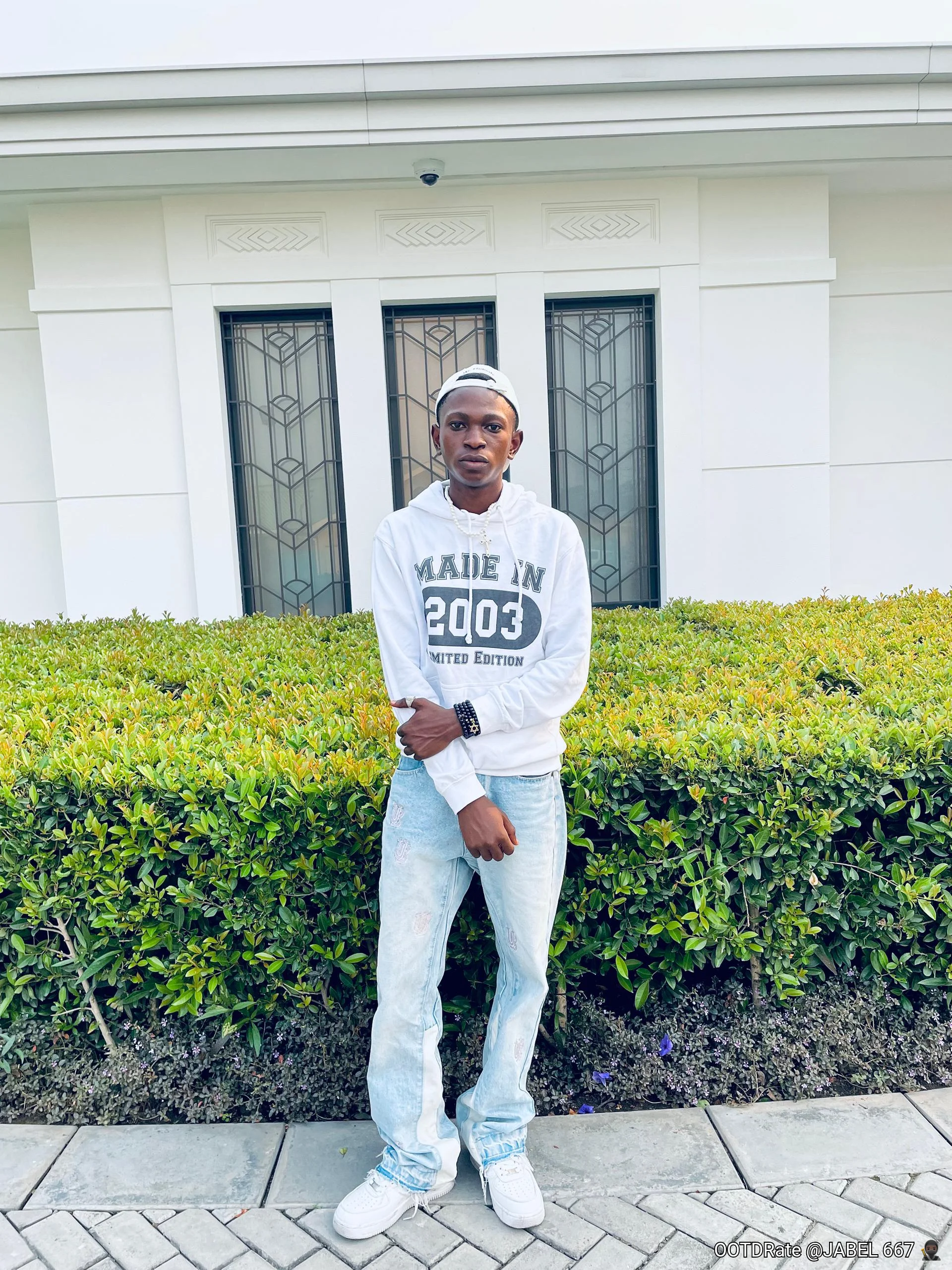 I would rate this outfit a 7.8 out of 10. The ensemble predominantly features a casual and clean streetwear style, highlighted by a white hoodie with bold text. This piece is both versatile and contemporary, fitting well within the urban style milieu. The light-wash jeans complement the hoodie, maintaining coherence in the outfit’s relaxed vibe. The casual jeans have a slightly washed-out appearance, adding depth to the simple palette.