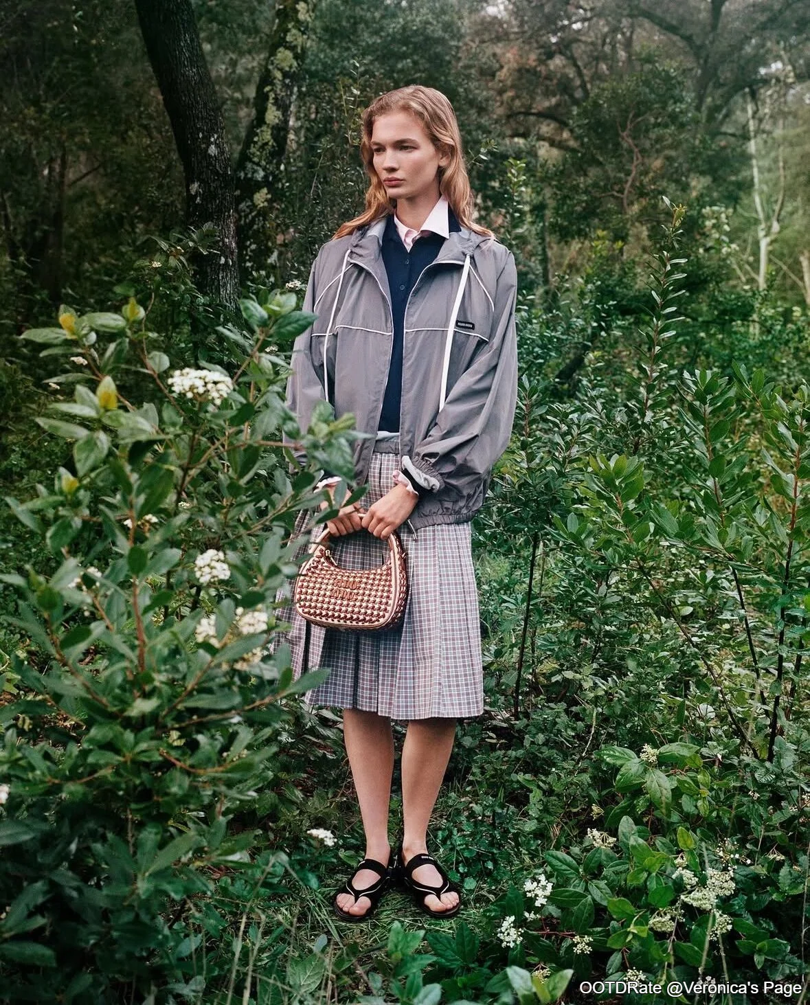 The black sandals are practical and match the laid-back vibe, but a pair of ankle boots or ballet flats could give a more polished finish. The woven handbag introduces texture and earthy tones, enhancing the outfit's nature-inspired setting.