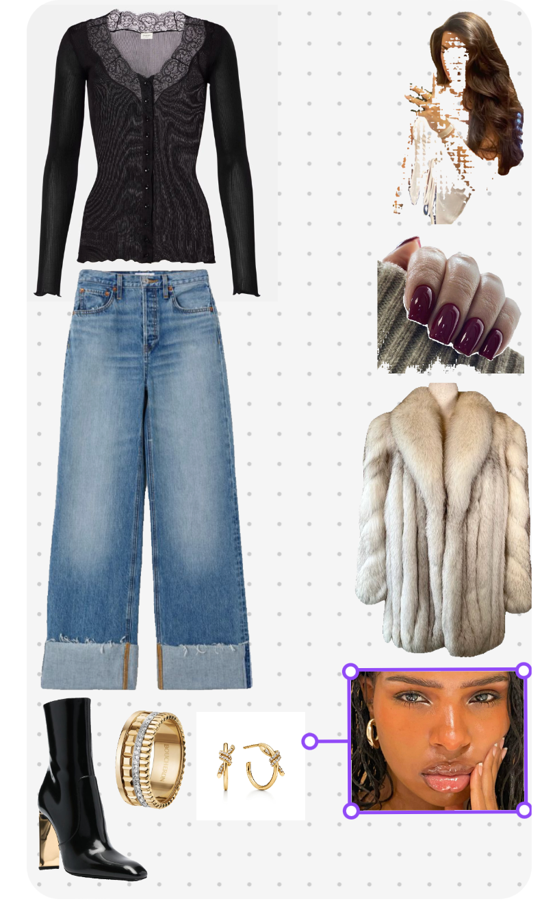 Edgy Elegance: Black Lace and Denim with Luxurious Fur Accents