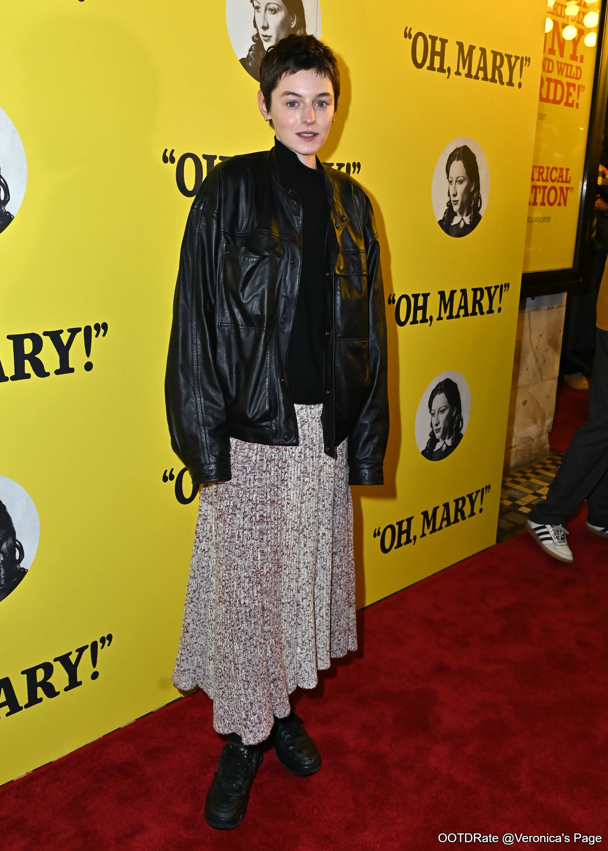 This outfit earns a 7.8 out of 10. The combination of a black leather jacket with a long, patterned skirt creates a striking contrast between edgy and soft elements. The leather jacket adds a touch of classic rock-inspired edge, emphasizing boldness, while the skirt introduces a gentle, flowing texture that softens the overall look.