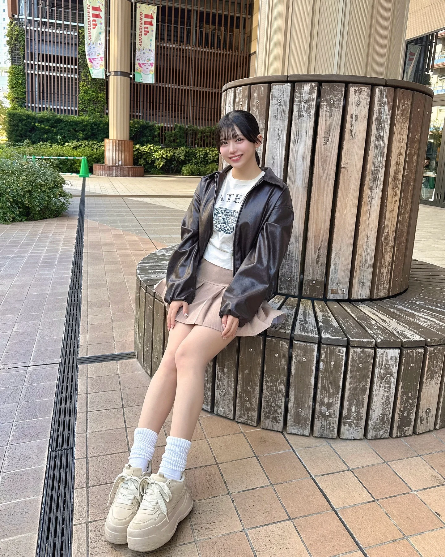 Casual Chic with Brown Leather Jacket, Beige Skirt, and Platform Sneakers