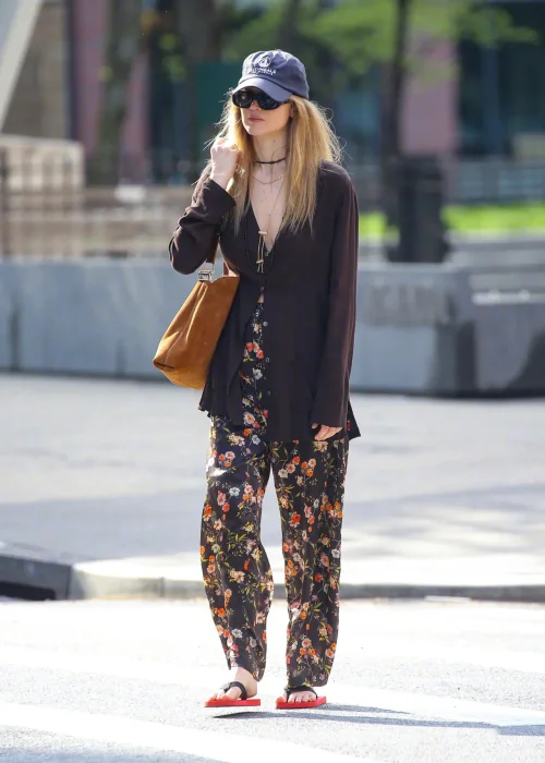 This outfit exemplifies a laid-back, bohemian vibe with a touch of urban flair. The dark, flowy top paired with floral palazzo pants creates a relaxed visual harmony, ideal for casual city strolls or informal gatherings. The muted floral pattern on the pants contrasts well with the solid dark top, adding depth and interest without overwhelming the senses.